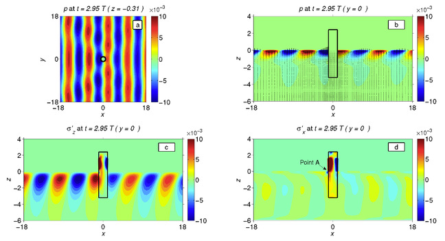 | 波浪-非均匀海床-海工建筑物相互作用的全动态模拟方法 推导出多孔介质海床全动态响应方程中八个关键土体参数的三维空间梯度项,引入以累积孔压为变量的土体剪切模量新表达式,在模型扩散项中考虑了土体剪切模量随时间的衰减效应,解决了传统常数假定下累积孔压计算值超出初始有效应力值而导致模拟结果失真的关键难点。计算结果表明三维空间梯度项对土体应力的影响可达68%,基于均匀海床假定的传统模型可高估单桩基础海床液化深度达50%。