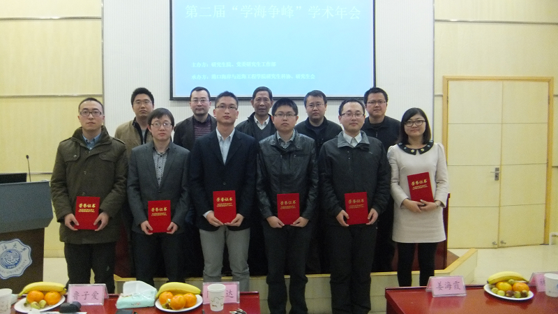 最后,工作人员统计出各位参赛选手的得分情况,11级博士研究生康彦彦同学勇夺第一,12级硕士研究生朱峰同学以及11级直博生倪兴业同学分获二、三等奖。在颁奖典礼之后,本次“学海争峰”学术年会圆满落下帷幕。