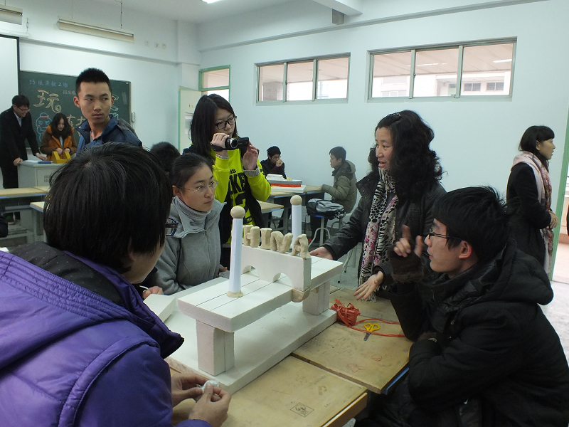下午两点,主持人宣布比赛开始,同学们立即展开模型的制作。各小组组员们共同商讨方案,明确分工,有条不紊。其间,评委老师对各小组的制作过程进行了观摩,并提出了宝贵意见,同学们就老师所提意见及时做出了相应的修改,使得模型更为美观并且更具实用性。在现场,班级副团支书杨欢还对各个小组进行了采访。虽然在整个制作过程中,各小组遇到了各种棘手的问题,但是同学们仍然积极开动脑筋,设法克服困难,使得最后的作品美观实用,吸引眼球。