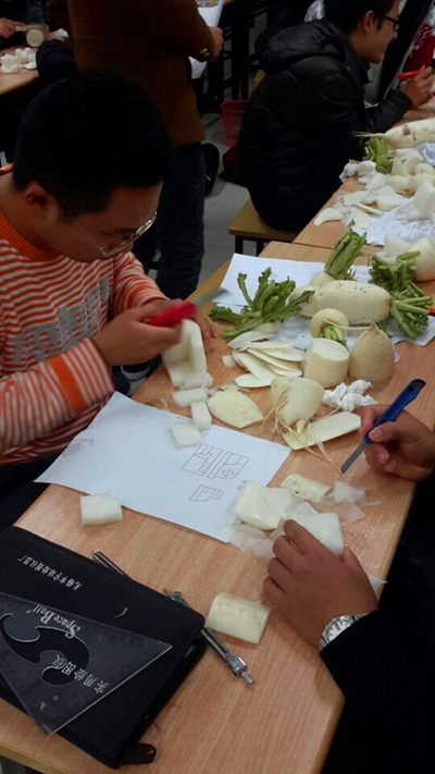 ”玩转工图”制模工图比赛活动通过三轮比赛,第一轮按萝卜对照三视图切出的模型数量进行评比的数量赛,第二轮比拼用最短时间把萝卜切成相应模型的速度赛,第三轮嘉宾通过切出来的模型质量来打分的记分赛形式决出最后的前三名并给予奖励。