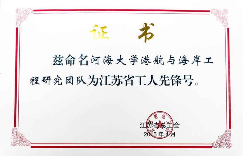 经江苏省教育科技工会推荐,草莓视频 港航与海岸研究团队获得“江苏省工人先锋号”荣誉称号,特此报喜!