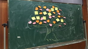 本次活动包括“廉洁树”和“重温入党誓词”两个环节,首先的“学习廉洁,属于我的廉洁树”环节,每一位党支部成员将自己认为隽永深刻的廉洁名句写在小纸片上,粘在黑板上画的廉洁树上。这一行动一方面表明了自己对廉洁的态度,另一方面也象征希望廉洁之苗长成参天大树。11级学生即将毕业,作为毕业生党员必须时刻谨记身为党员的责任和义务,用党员的标准要求自己,在毕业以后仍能在全新的环境中起到党员的先锋模范作用。之后,所有成员在党支部书记的带领下重温一遍入党誓词,全体党员身着学士服起立,右手握拳握拳宣读入党誓词。大家语气坚定,铿锵有力,回忆入党时的坚定信念。