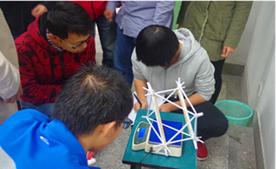 顶着凛冽的寒风,参赛选手们早早就带着参赛作品来到比赛地点。各小组成员热情地交流心得,分享制作过程中的得失。九点整,活动正式拉开了序幕。本次比赛共有97个小组参加。在整个比赛过程中,不少选手的作品令评委大为惊叹,不得不佩服同学们的奇思妙想。参赛作品有的在支脚处加了泡沫,有的裹上了几层厚的胶带,有的连上气球做成“热气球”……其中,42号小组更是把作品做成“冰淇淋”的形状,在众多作品中“鹤立鸡群”,让人赞叹于同学们的奇思妙想。