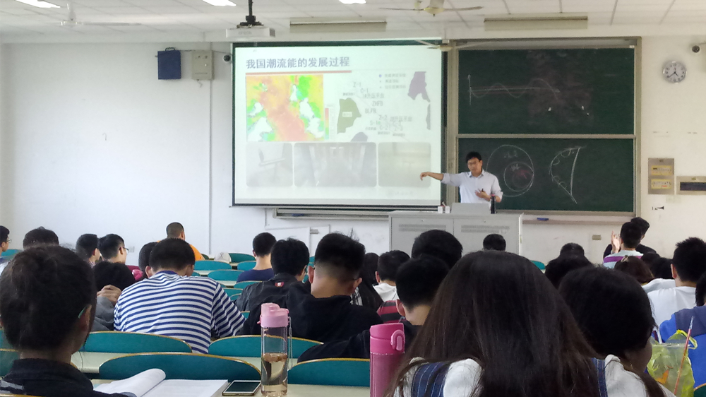 讲座开始前,张老师先给同学们展示了一些图片,雾霾、全球变暖引发的冰川融化、海平面上升等现实问题让同学们陷入了沉思。煤炭、油气等传统能源的大量消耗不可避免地带来一系列环境问题,所以要解决环境问题从根本上讲就是要解决能源问题,当务之急就是要找到污染很小或无污染的可再生清洁能源,因此,开发和利用海洋可再生能源已是‘箭在弦上、不得不发’,各种针对性的研究工作和示范工程建设也已经刻不容缓。张老师的一段图文并茂、数据详实的导引有力地吸引了同学们的注意力。