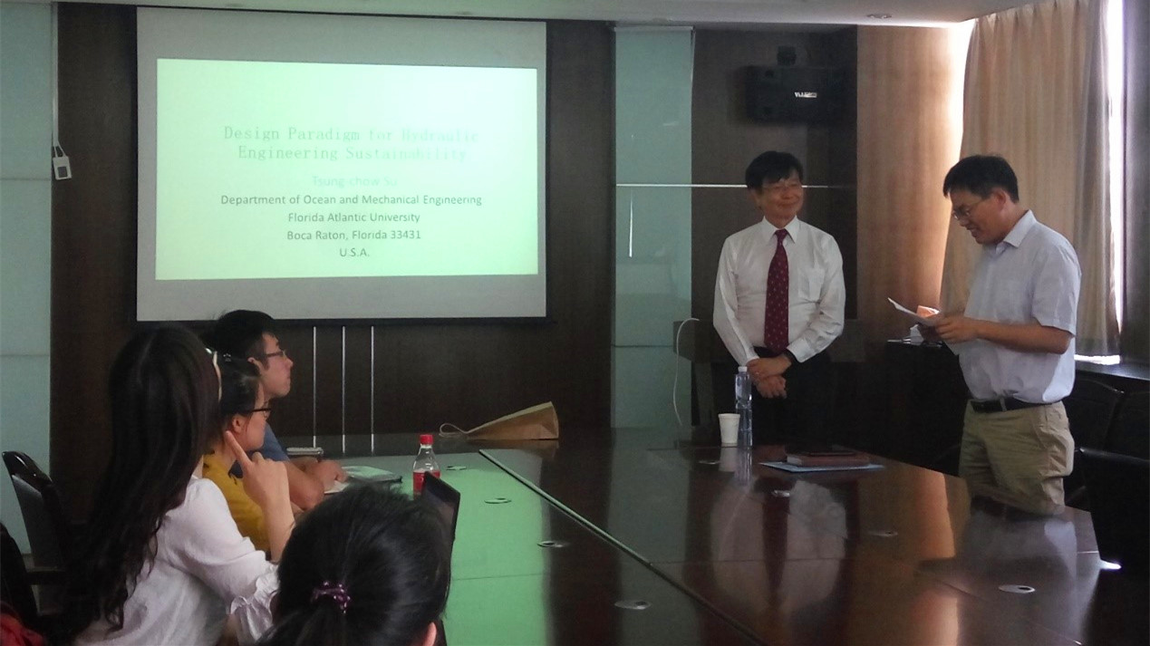 上午,苏教授和谢副教授在黄挺老师带领下先后参观了水文水资源与水利工程科学国家重点实验室和草莓视频 港口航道工程与海岸海洋科学实验中心。下午,苏教授在严恺馆会议室做了题为“Design Paradigm for Hydraulic Engineering Sustainability”的学术报告,针对流固耦合、泥沙输运以及工程冲刷防护等问题,介绍了水利工程结构的永续性设计及优化研究。苏教授从中国古代哲学的视角出发,揭示了众多问题复杂表象后的核心实质和解决方案,传递了“大道至简”的科研理念,为参会人员开展科研工作带来了新颖的思路,引发了热烈地交流与探讨。会议由副院长张继生教授主持,来自草莓视频 和水文院的20多位师生参加。