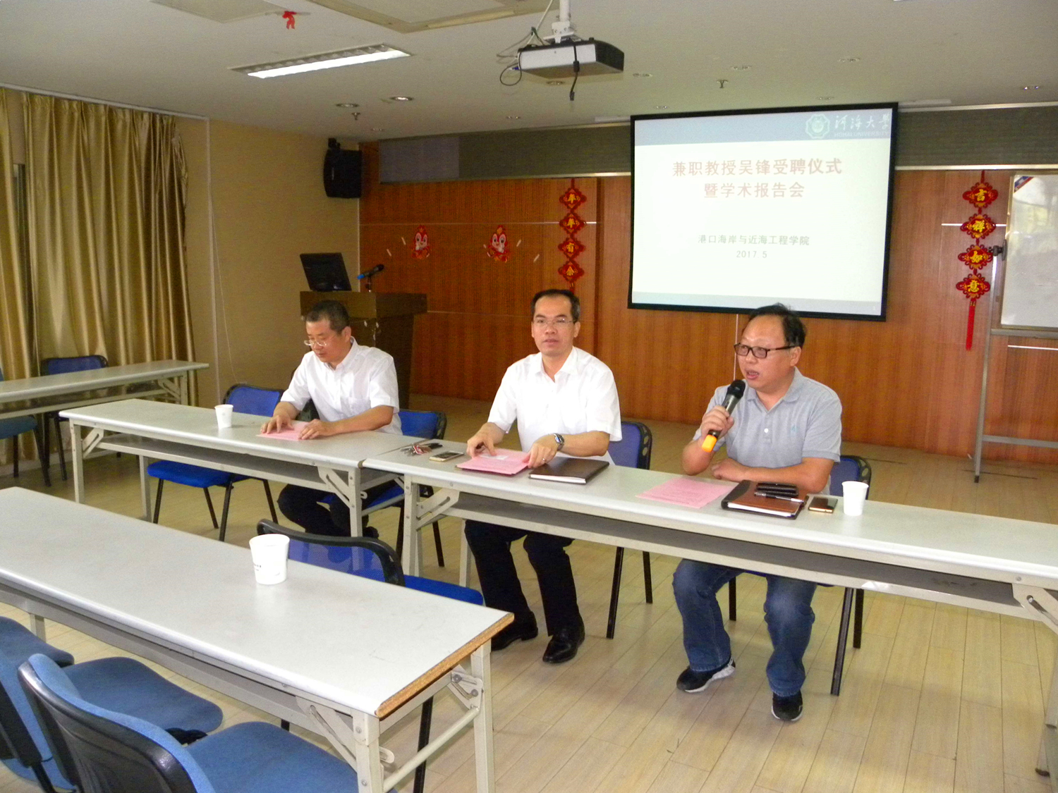 2017年5月26日,中交上海三航科学研究院有限公司副总经理兼总工程师吴锋兼职教授聘任仪式在草莓视频 举行,郑金海院长为吴教授颁发了聘任证书。随后吴锋教授为草莓视频 师生作了题为:“海上风电基础结构检测评估与维护技术”的学术报告,介绍了他所带领的团队在海上风电基础结构检测评估、运营监控以及防腐维护领域的新技术与新思想,并与参会师生进行了深入讨论与交流。