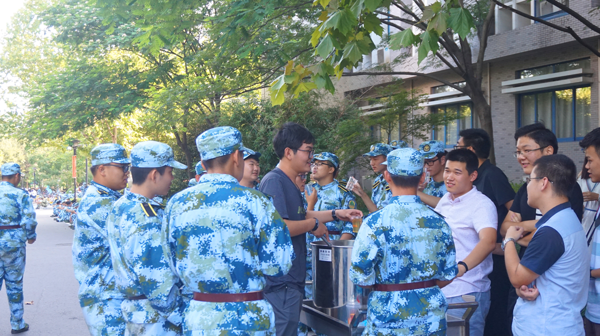 随后,一行人又来到了三连,看望在此军训的男生们。训练结束,男生们早已迫不及待,在接过一杯杯凉茶的同时,也不忘对辅导员和学长学姐们表达着自己由衷的谢意,大家一边说笑,一边品味“清凉”,在融洽的气氛中,忘却了一身的疲惫。