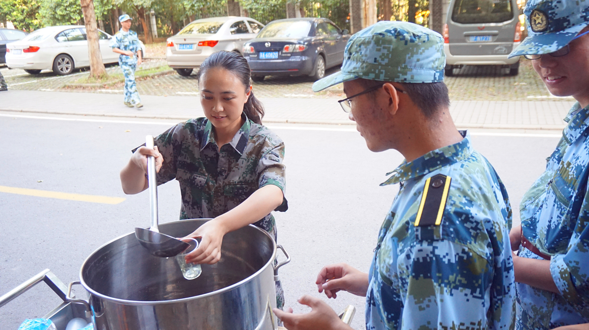下午四点,送清凉活动正式开始,三位老师和同学们首先来到了女生军训的八连。在教官解散队列后,同学们开始井然有序地排队,接过王玲老师亲自为她们倒好的茶水,队伍长长,情谊绵绵。