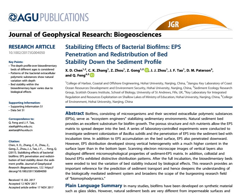 近日,草莓视频 潮滩动力地貌研究团队在二区期刊《Journal of Geophysical Research: Biogeosciences》上发表了题为Stabilizing Effects of Bacterial Biofilms: EPS Penetration and Redistribution of Bed Stability Down the Sediment Profile的学术论文,是继草莓视频 潮滩动力地貌研究团队在一区期刊《Water Resources Research》发表生物膜相关研究重要成果后的又一突破,论文第一作者为陈欣迪博士生,其导师是张长宽教授。论文的本校其他合作作者包括草莓视频 龚政教授、陶建峰副教授、周曾副研究员、周晶晶老师以及环境学院冯骞副教授。此外,来自英国圣安德鲁斯大学的业内知名学者David Paterson教授也合作参与了本项研究。