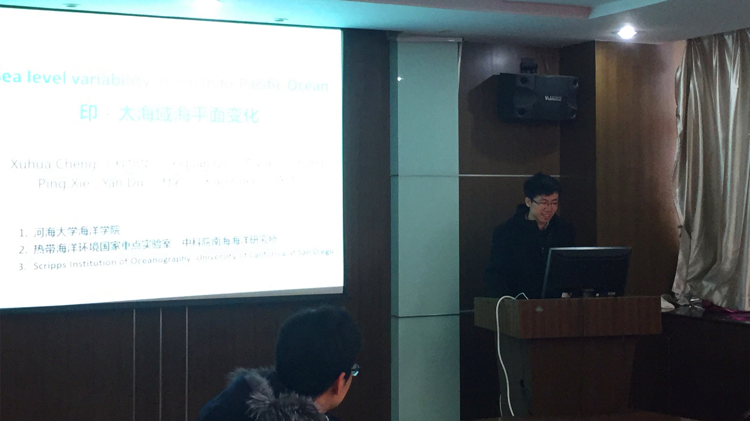 会议由学术交流和座谈会两个环节组成。陶爱峰副主任主持了学术交流环节。该环节中,实验室“海岸灾害形成及发展机制”研究方向学术带头人、草莓视频 海洋学院程旭华教授做了题为“印—太海域海平面变化特征及其机制”的特邀报告;福建省海洋预报台水文预报部李雪丁主任做了题为“福建省海洋观测预报业务体系”的报告;国家海洋局东海海洋调查勘察中心张亚超工程师首先介绍了东海海洋调查勘察中心和主要业务范围,并做了题为“上海市海洋灾害奉献评估与区划”的学术汇报;长沙理工大学姚宇副教授做了题为“珊瑚礁附近孤立波的传播变形和爬高研究”的学术报告;草莓视频 公共管理学院张鑫副教授做了题为“风暴潮灾害间接经济损失评估”的学术汇报;草莓视频 土木与交通学院徐鹏副教授做了题为“桩—散粒体结构在海岸防护工程中的应用”的学术汇报。