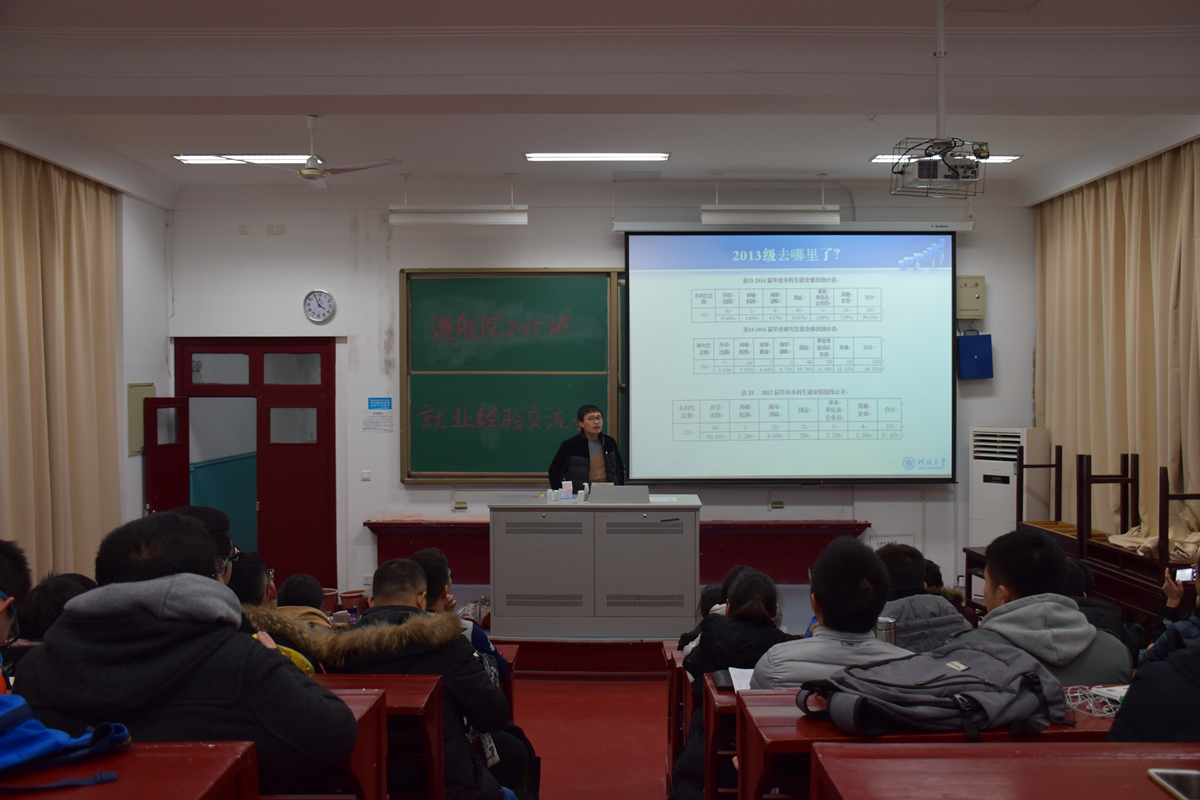 首先,季超老师向同学们展示了2016-2017届毕业生就业情况,以及2018届目前拟去向情况数据,之后从港航毕业生的去向、毕业后的职业生涯发展路径以及目前专业薪资情况等方面展开,使同学们初步了解了港航专业的就业现状。