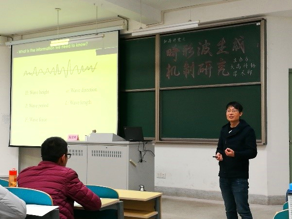 2017年12月7日,陶爱峰副教授应邀参加大禹学院知禹讲堂,为大二本科生做了题为“畸形波生成机制研究”的学术报告。报告由浅入深,先从最基本的海浪常识讲起,逐步过渡到非线性水波现象,最后讲解了畸形波问题,报告引起了学生们的浓厚兴趣。报告结束后,陶老师在学生提问环节与学生开展了深入的讨论。