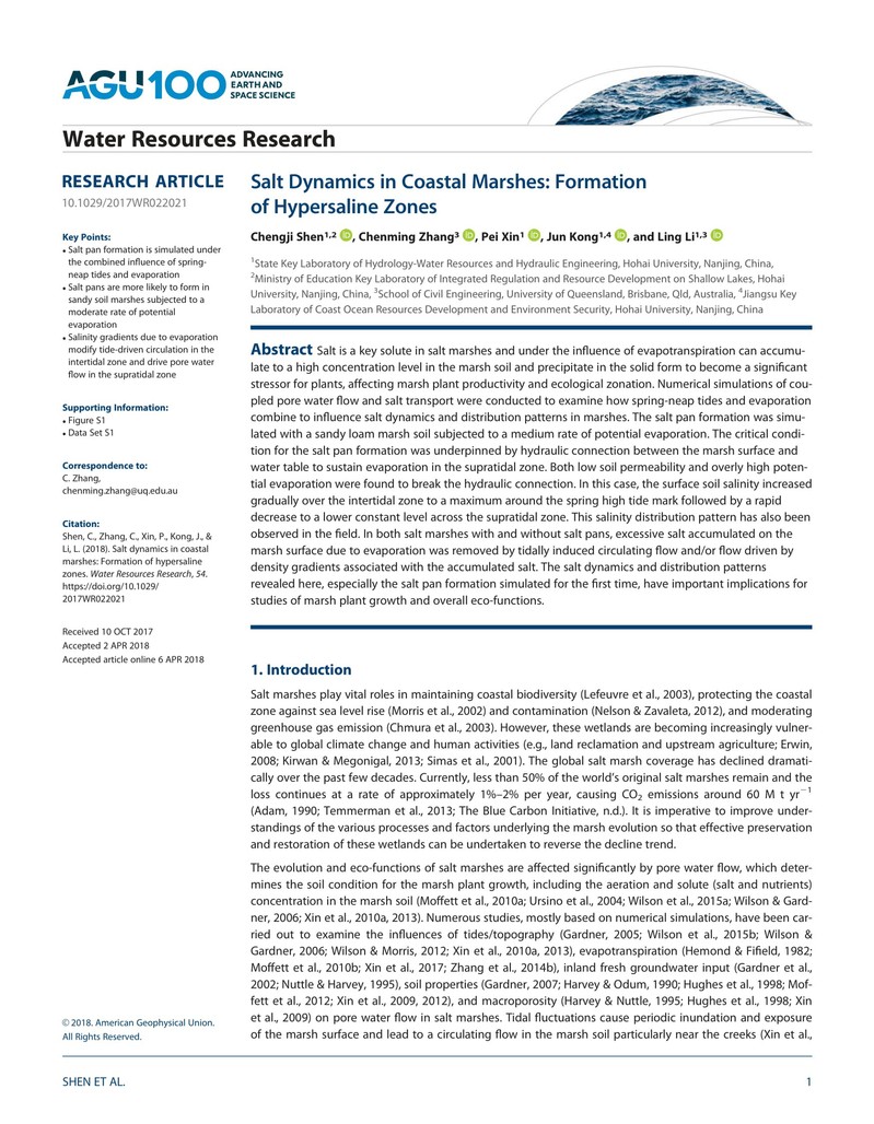 近日,草莓视频 海防所沈城吉博士、孔俊教授在国际权威期刊 《Water Resources Research》 (一区TOP,影响因子4.397)发表题为“Salt Dynamics in Coastal Marshes: Formation of Hypersaline Zones”的学术论文。