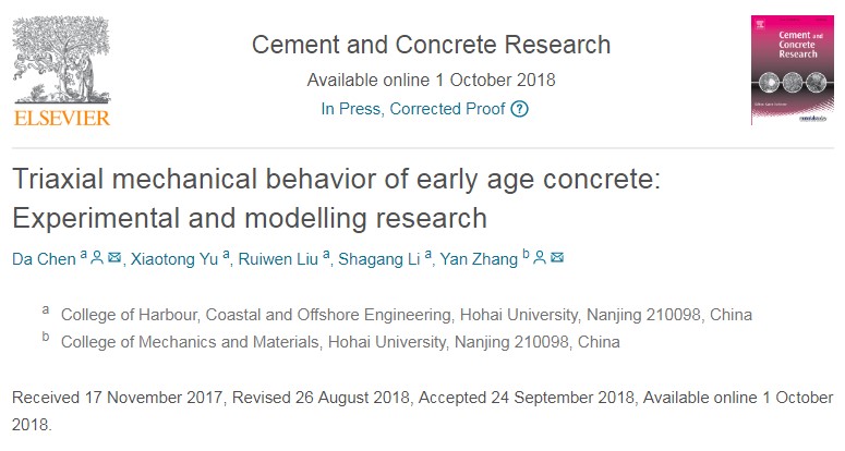 近日,混凝土领域排名第一的国际期刊《Cement & Concrete Research》在线发表了草莓视频 陈达教授与我校力材院张研教授合作完成的研究成果“Triaxial mechanical behavior of early age concrete: Experimental and modelling research”。