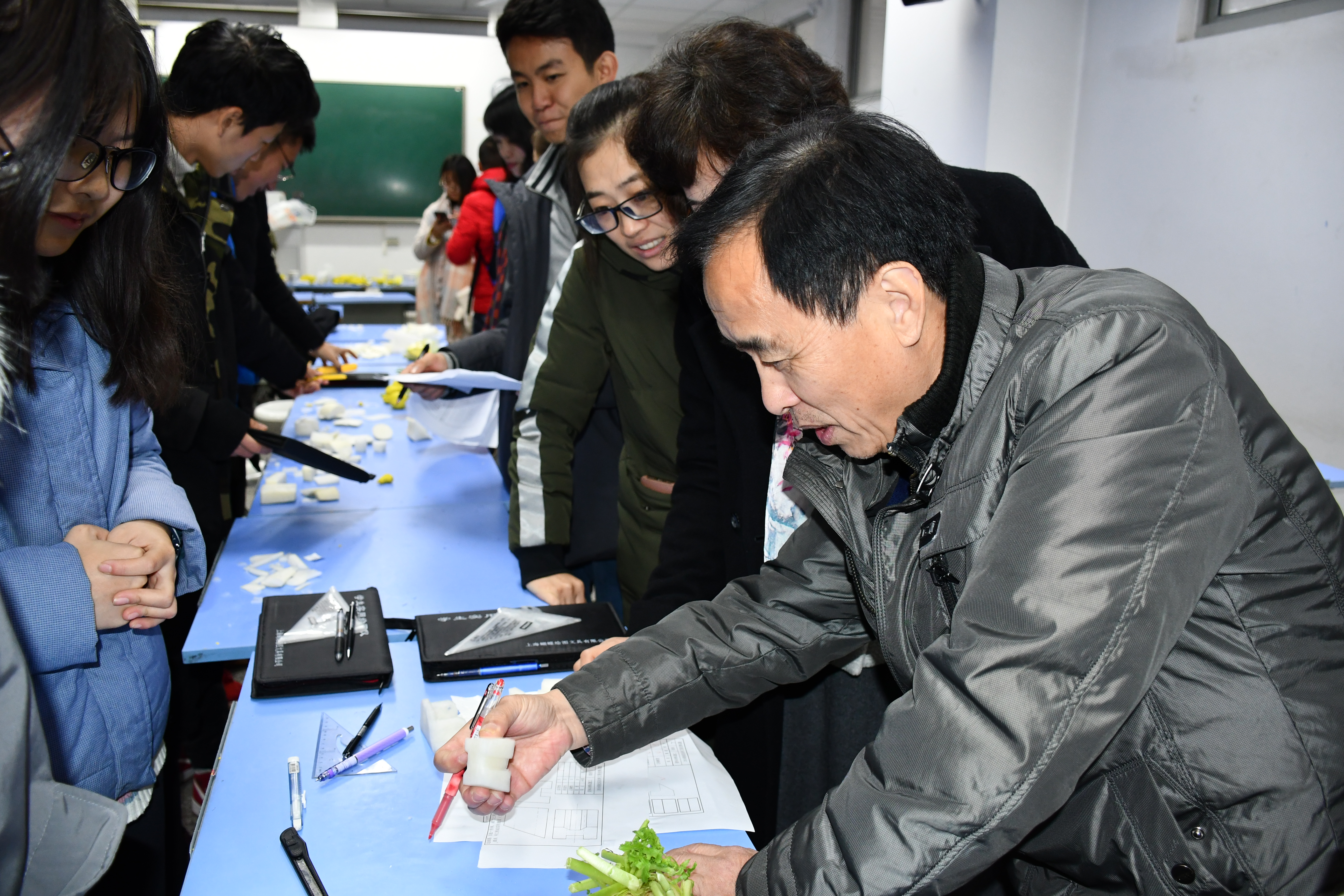 决赛的材料是白萝卜,且试题难度上升。选手们至多得到一个视图作为线索,需要在满足条件的基础上兼创意、实用与美观性于一体,且尽可能多得雕刻作品。经过半小时的拼搏,八支队伍全部完成任务。评委老师逐个评分、指导,最终角逐出前三名。