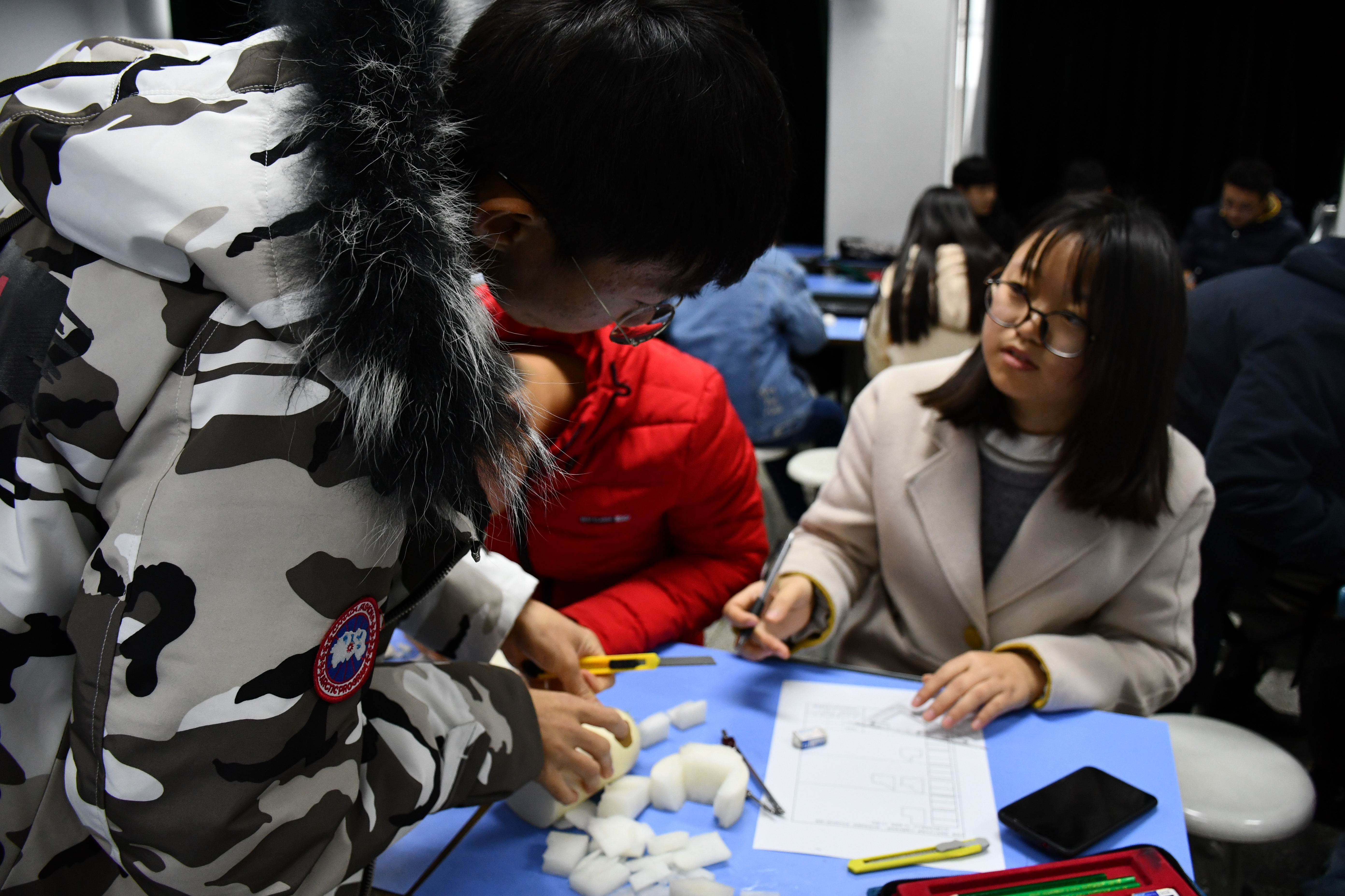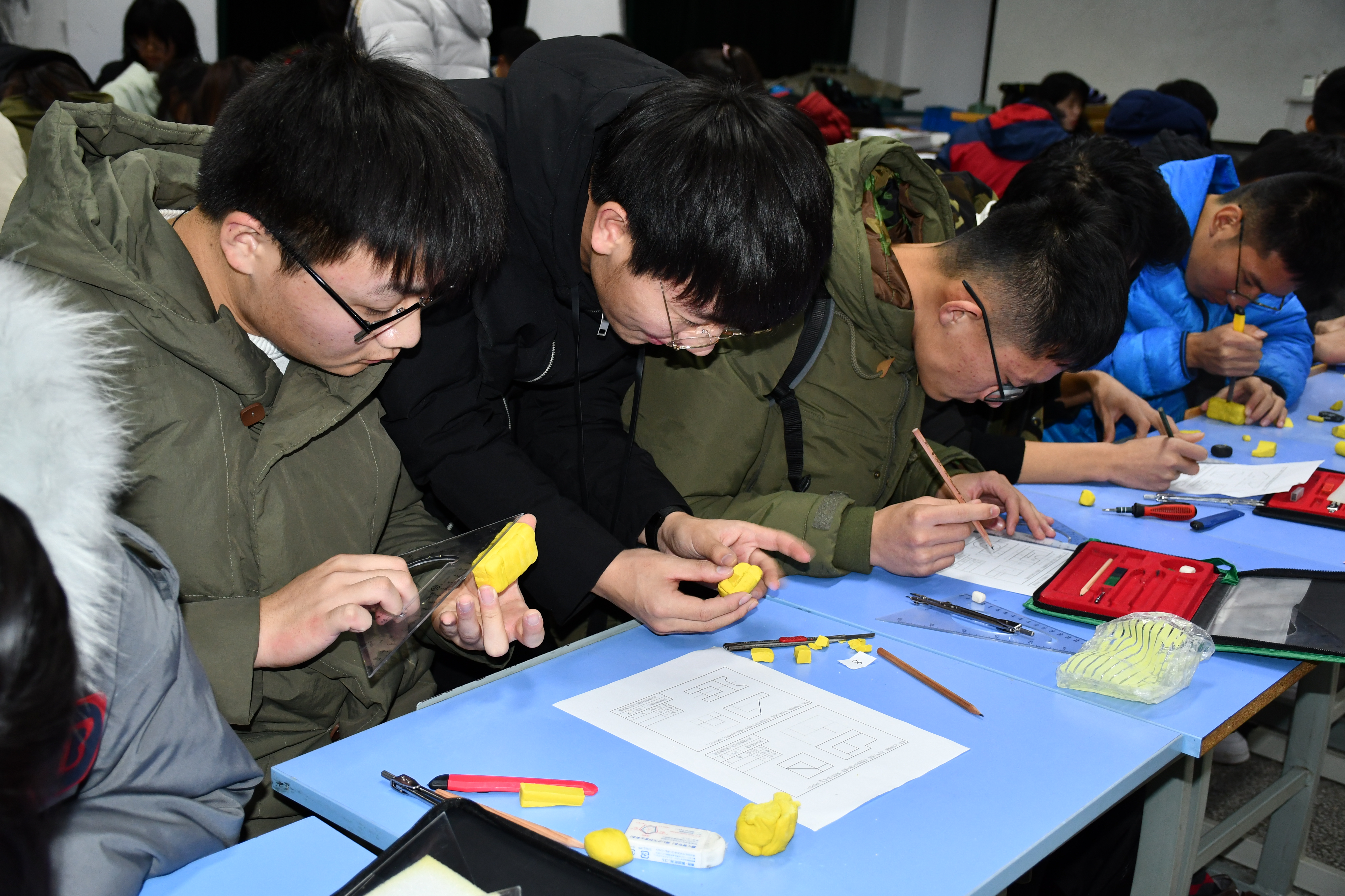 本次竞赛为团体赛,分两轮进行。首轮为团体初赛,21支团队根据试题补齐三视图并用事先准备好的油泥,按照1:1的比例塑造实物。21支团队各有分工,有的团队从画图到塑形,每名成员独立负责一道题;而有的团队每名成员负责不同的环节,画图的画图,切块的切块,组合的组合。21支团队争分夺秒,十分激烈。初赛结束后根据评委老师打分,分数最高的八支团队进入决赛。