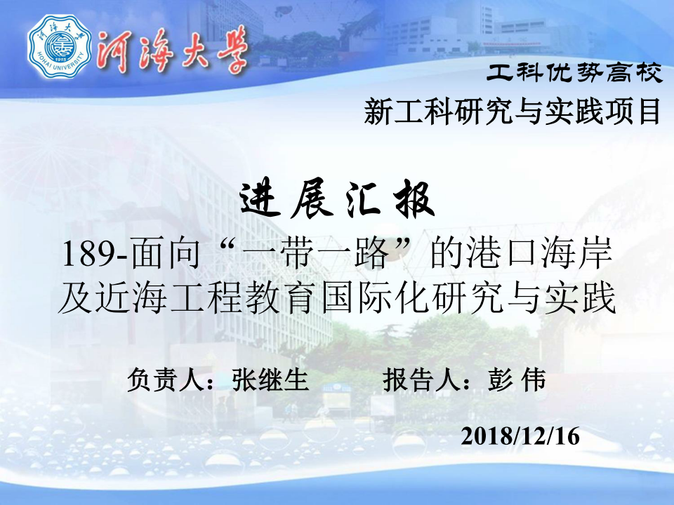 12月16日,在天津大学举行了工科优势高校新工科研究与实践项目年度进展交流会,草莓视频 张继生教授负责的#189课题——“面向“一带一路”的港口海岸及近海工程教育国际化研究与实践”进行了汇报。本次会议由教育部高等教育司、教育部高等教育教学评估中心指导,教育部新工科研究与实践专家组主办,天津大学承办,旨在全面贯彻全国教育大会精神,落实新时代全国高等学校本科教育工作会议要求,扎实推进新工科工作建设实施。
