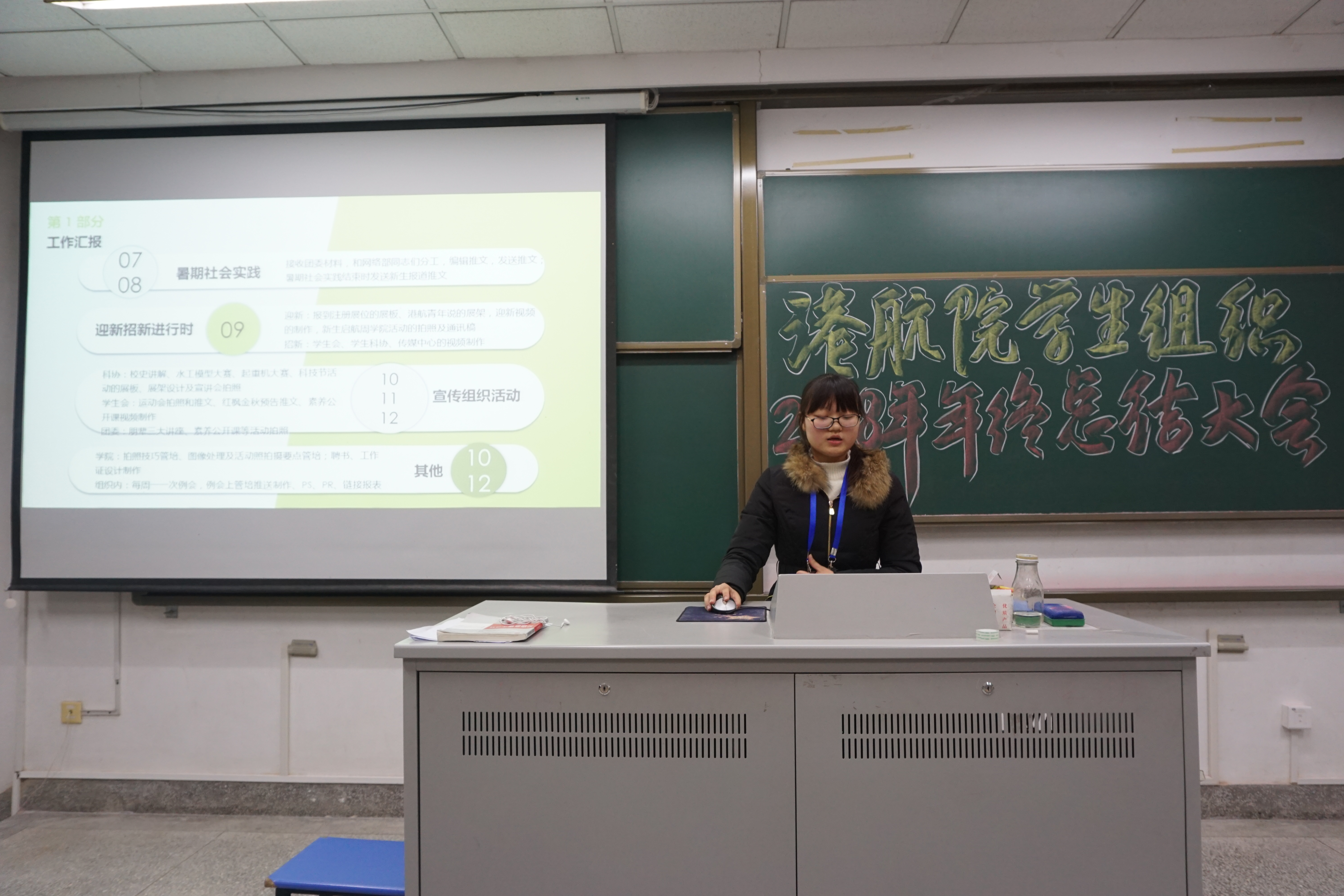 学生会副主席周洁总结了学生会在本学期进行的活动,在完成传统活动“港航杯”篮球赛、校运会志愿服务等工作的基础上,着力弘扬中华优秀传统文化,举办了红枫金秋系列活动之“秋韵”诗词大会,在诗词雅韵中引导同学弘扬和践行社会主义核心价值观,进一步扩大了中华优秀传统文化与主题教育活动的交融。周洁同时汇报了学生会下一个学期的工作计划。
