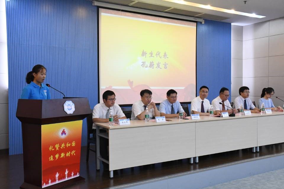 随后,教师代表苏静波老师以校训为引,从适应艰苦朴素的生活、秉承实事求是的态度、坚持严格要求的信条和贯彻勇于探索的精神四个方面向新生解答了大学生活如何渡过这个问题。2019级孔蔚同学代表新生发言,表示新生们将在追梦的旅途中用自己的青春和汗水勾勒出最美的故事画卷。
