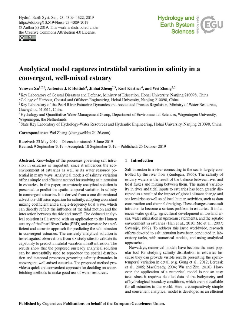 近日,草莓视频 海岸及海洋工程研究所徐龑文博士后和张蔚教授(通讯作者)在中科院一区国际学术期刊《Hydrology and Earth System Sciences》上发表高质量研究论文“Analytical model captures intratidal variation in salinity in a convergent, well-mixed estuary”。此研究是由草莓视频 张蔚教授研究团队领衔,与荷兰瓦赫宁根大学环境科学系Hydrology and Quantitative Water Management Group荷兰和德国学者组成的研究团队合作完成。