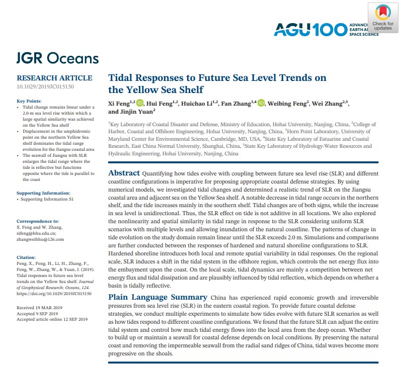 近日,隶属海岸灾害及防护教育部重点实验室(草莓视频 ),(Key Laboratory of Coastal Disaster and Defence (Hohai University), Ministry of Education)的冯曦老师携研究生冯辉、李慧超等在国际学术TOP期刊《Journal of Geophysical Research: Oceans》上发表高质量研究论文“Tidal responses to future sea level trends on the Yellow Sea shelf”。该论文阐明了复杂海岸带环境下,海平面上升与潮能演化之间的动态规律,首次界定了在中国特有的开放式海岸条件下,近岸潮能演变规律由线性形态到非线性形态的零界位置。同时,指出了在刚性和柔性护岸不同条件下,黄海大陆架近岸潮能应对海平面上升的自适性。该论文反映了平行岸线的前进潮波与垂直岸线的类驻波潮波与不同护岸之间的组合关系;从运动机制与动力机制两方面分别揭示了柔性护岸与刚性护岸工程对近未来(100年间)潮能发展的状态。该成果不仅具有重要的理论意义,而且对目前我国的生态护岸工程也有广泛的现实借鉴作用。