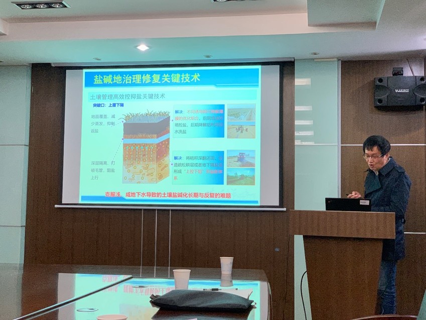 杨劲松研究员作了题为“盐碱地生态治理的思考与实践”的学术报告。报告中,杨研究员首先介绍了土壤盐碱问题的成因,强调了盐碱障碍易发条件和区域,并讲述了其延伸危害。杨研究员以多个实际工程为例,具体讲解了不同类型的盐碱地修复技术,并且从量化盐渍障碍的影响、阻控氮素环境损耗、激发磷素有效性、提升氮磷综合效率四个方面分析了滨海盐碱农田养分增效的问题。最后,杨研究员还进一步说明了关键技术研发、产业技术集成、盐碱地治理利用典型技术体系的相关思考。