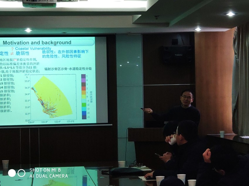 汪亚平教授作了题为“海南岛海岸带脆弱性评价初步研究”的学术报告。汪教授从地貌稳定性是否等于脆弱性出发详细介绍了稳定性指标的等级划分,并且由国外对海岸脆弱性指数的研究论文引出针对我国淤泥质海滩、海湾等地貌类型的恢复能力的思考。针对现评判指标的不足,汪教授创新地提出了由自然因子、人类因子、动态因子加权平均构成的海岸脆弱性指数。该海岸脆弱性指数综合考虑了海岸类型、沉积物运输趋势、平均潮差、有效波高、平均含沙量、城市化水平、海域分级、岸线侵蚀后退速度、平均淤积速度等因素。最后,汪教授展示了其团队在海南岛地区进行了大量的采样调研成果,充分说明了海岸脆弱性指数在实践应用层面上具有极高的价值。