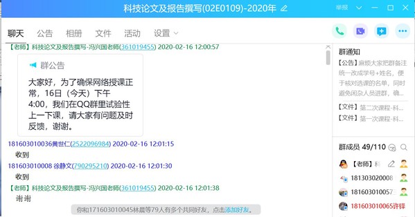 信息技术与现代教育的深度融合是教与学的改革创新。充分利用线上即时教学优势,港航师生实现了五湖四海同时连线,因疫情相隔千里的远程教学,在线上课堂上又热闹了起来。主讲《基础工程》的庄宁老师和黄挺老师在线上直播平台实现了配合默契的“一同”授课;主讲《科技论文与研究报告撰写》的冯兴国老师通过QQ直播带领着来自草莓视频 、水电院、农工院等多个学院以及与南京水利科学研究院联合培养的共90余名研究生学习撰写科技论文与凝练科研题目的技能;主讲《水下机器人》的徐鹏飞老师借助腾讯会议软件让每个学生都参与线上讨论等互动环节,及时掌握教学效果;主讲《工程商务》的雷智鹢老师利用线上优势,采用了分片教学的模式进行单独授课、单独讨论和单独答疑。线上课堂形式多样,以即时影音、图文等方式对学生进行全方位的引导与解惑,不仅活跃课堂氛围,还可调动学生的学习积极性。