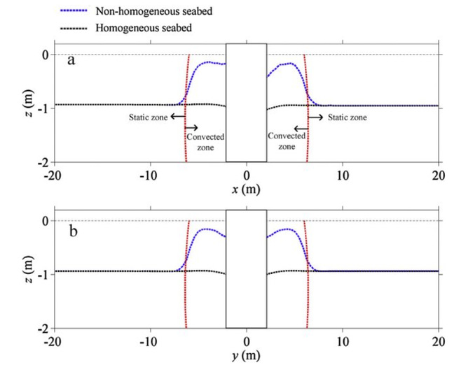| 波浪-非均匀海床-海工建筑物相互作用的全动态模拟方法 推导出多孔介质海床全动态响应方程中八个关键土体参数的三维空间梯度项,引入以累积孔压为变量的土体剪切模量新表达式,在模型扩散项中考虑了土体剪切模量随时间的衰减效应,解决了传统常数假定下累积孔压计算值超出初始有效应力值而导致模拟结果失真的关键难点。计算结果表明三维空间梯度项对土体应力的影响可达68%,基于均匀海床假定的传统模型可高估单桩基础海床液化深度达50%。