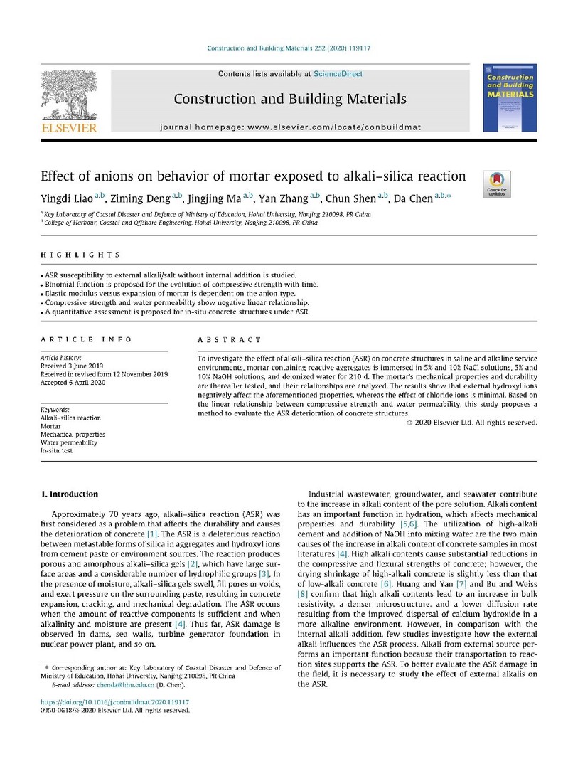 近日,工程技术学科一区TOP期刊《Construction and Building Materials》(影响因子4.046)在线发表草莓视频 廖迎娣副教授完成的研究成果“Effect of anions on behavior of mortar exposed to alkali–silica reaction”。