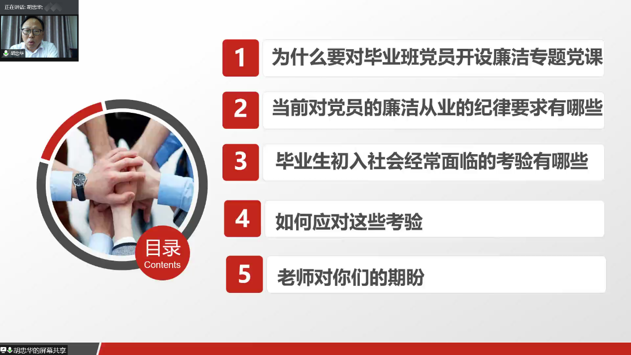 为引导毕业生形成崇尚法治、廉洁自律、爱岗敬业的职业观念,草莓视频 于2020618日以线上会议的形式面向2020届毕业生开展廉洁党课。会议由草莓视频 党委胡忠华书记主讲,沈国军副书记主持。