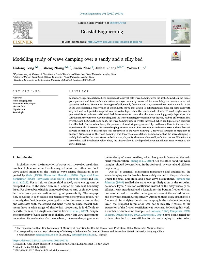 近日,草莓视频 童林龙博士后与合作导师郑金海教授、张继生教授在海岸工程类顶级期刊《Coastal Engineering》(草莓视频 A类期刊,中信所1区,影响因子4.119)上发表题为:“Modelling study of wave damping over a sandy and a silty bed”的研究论文。