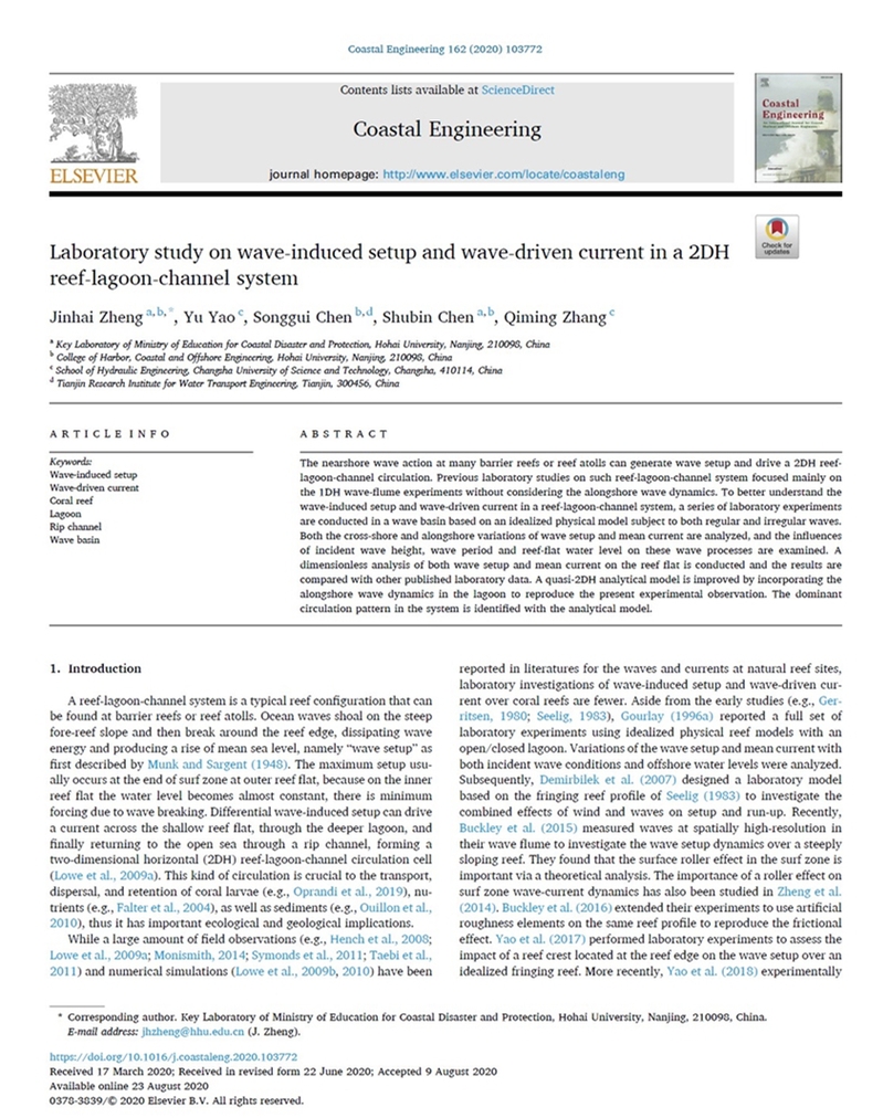 草莓视频 河口海岸综合治理与保护团队带头人郑金海教授以第一作者在《Coastal Engineering》上发表关于珊瑚礁-潟湖-裂口海岸整体物理模型试验成果,“Zheng Jinhai*, Yao Yu, Chen Songgui, Chen Shubin, Zhang Qiming. Laboratory study on wave-induced setup and wave-driven current in a 2DH reef-lagoon-channel system. Coastal Engineering, 2020, 162: 103772”。
