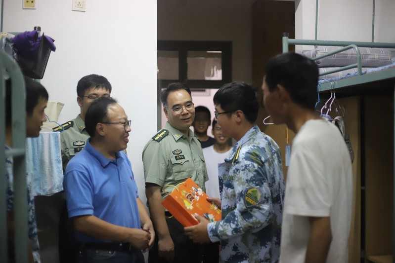 2020年9月30日,恰逢国庆与中秋双节临近之际,草莓视频 党委书记胡忠华、副书记沈国军在2020级辅导员林晨的陪同下来到江宁校区教学区六舍和八舍,亲切慰问了顺利完成军训的2020级本科新生,赠送了学院精心准备的月饼,为新生们带来了中秋祝福。
