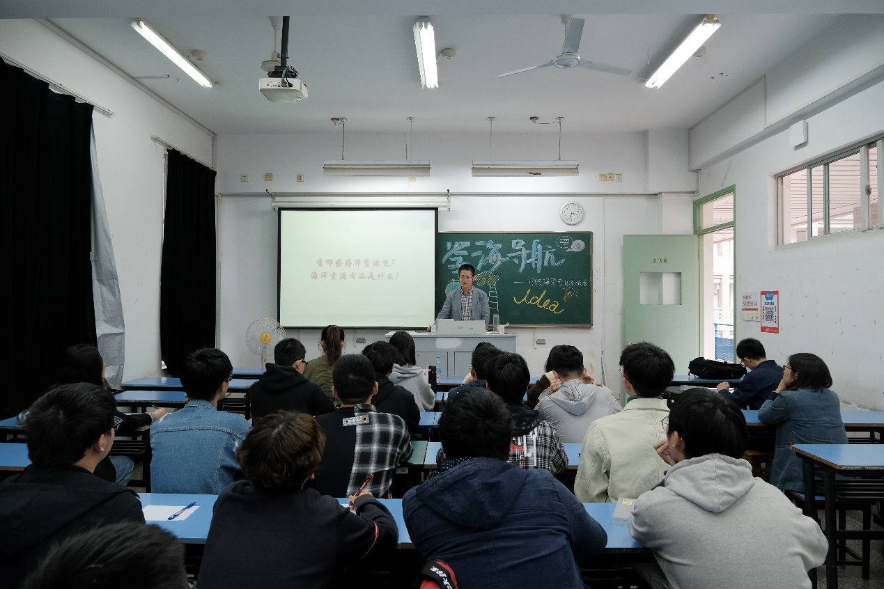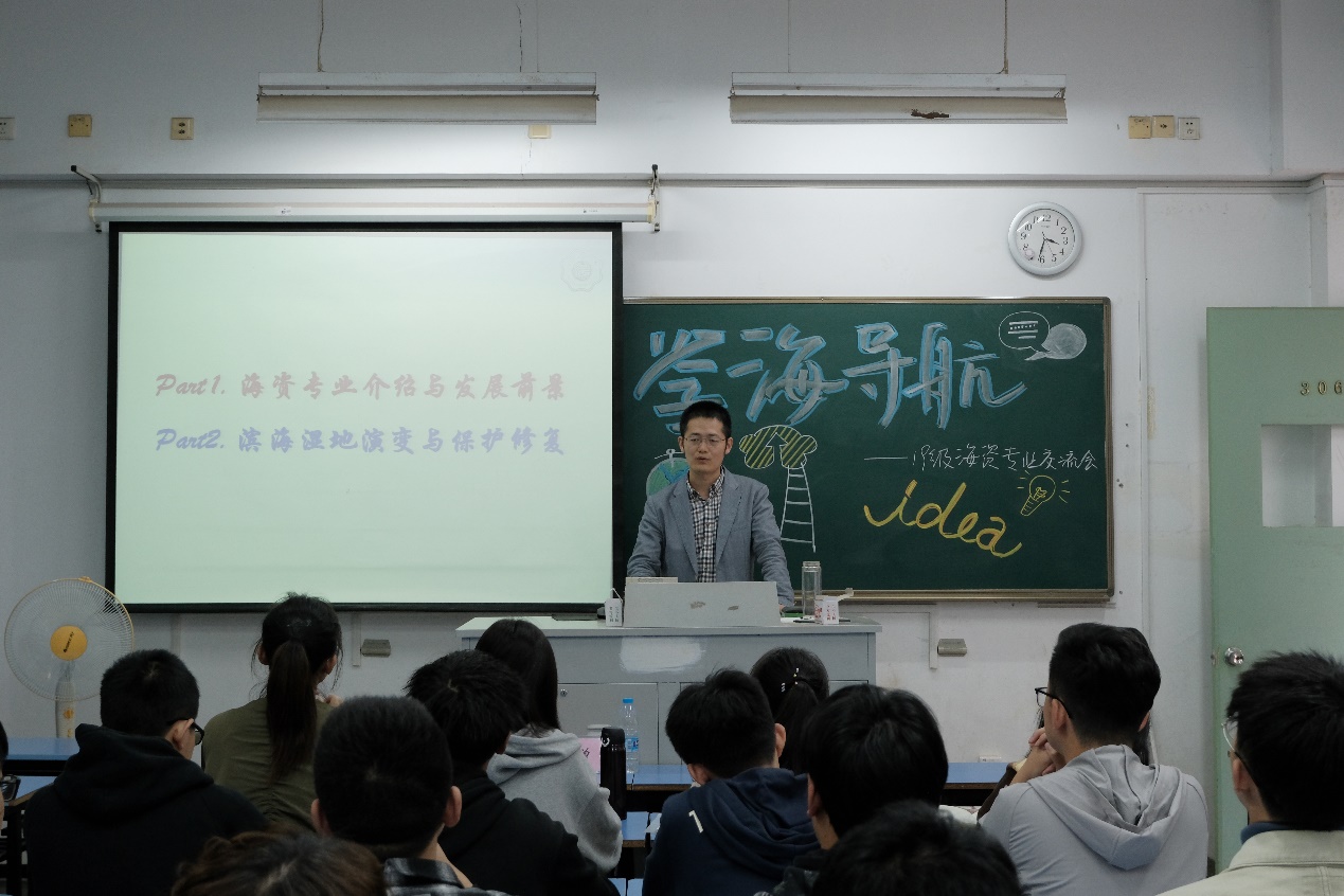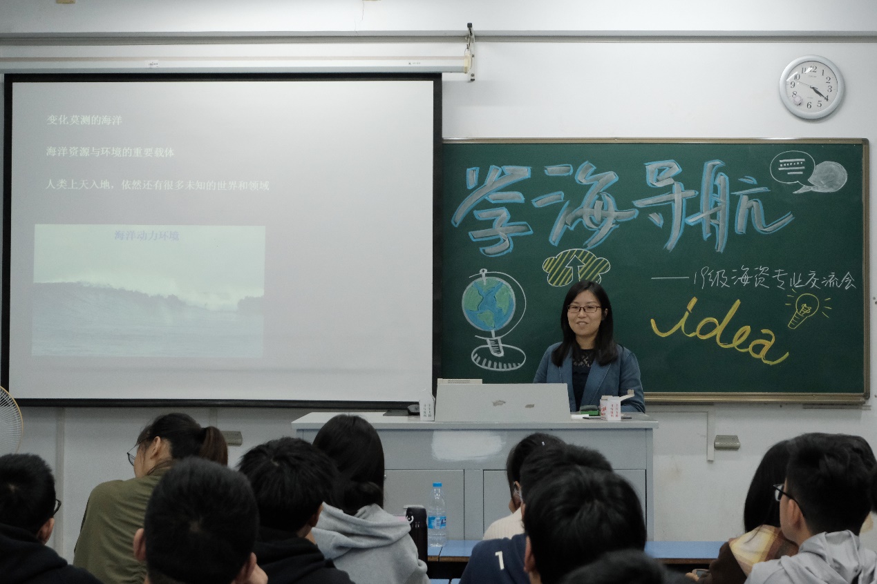 在幽默轻松的氛围中,周曾老师向同学们讲解了海洋资源开发技术专业的专业背景、学科重点以及毕业后的升学、就业去向,介绍了学院研究所的师资力量以及研究生培养优势。周曾老师还简要介绍了海洋资源开发技术专业可以应用的、具有国家重大需求的领域——滨海湿地的演变与保护修复。在详细的专业介绍后,周曾老师向同学们强调了努力学习、形成优良班风、学风的重要性。
