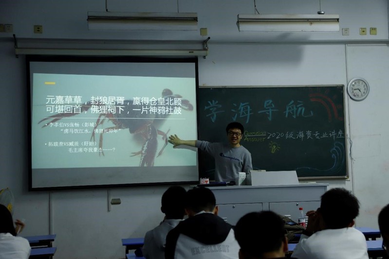 紧接着,潘毅老师引用了许多历史典故来告诉同学们为什么要爱国,通过描述当今世界形势来引导同学们怎么热爱祖国。之后,潘老师向同学们讲述了独立思考和开放思维的重要性。最后,潘老师介绍了个人的研究方向与海资专业方面的认知,在潘老师的讲述下,同学们对以后的学习与研究有了进一步的了解,也对以后的发展方向有了更加清晰的目标。