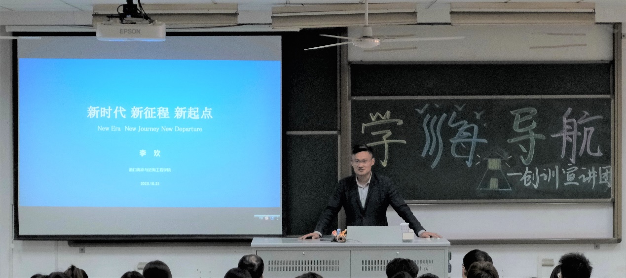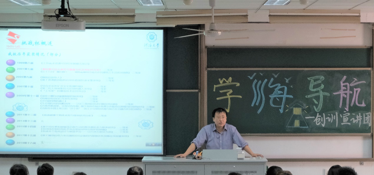 张蔚副院长从为什么要开展大学生创训、怎么才能做好大学生创训、从大学生创训中获取什么三个方面向同学们介绍创训,另外他还向同学们介绍了现在学长学姐正在的挑战杯的项目和河口三角洲动力地貌和盐水入侵等方面的科研情况,呼吁大家积极参与到创训之中。