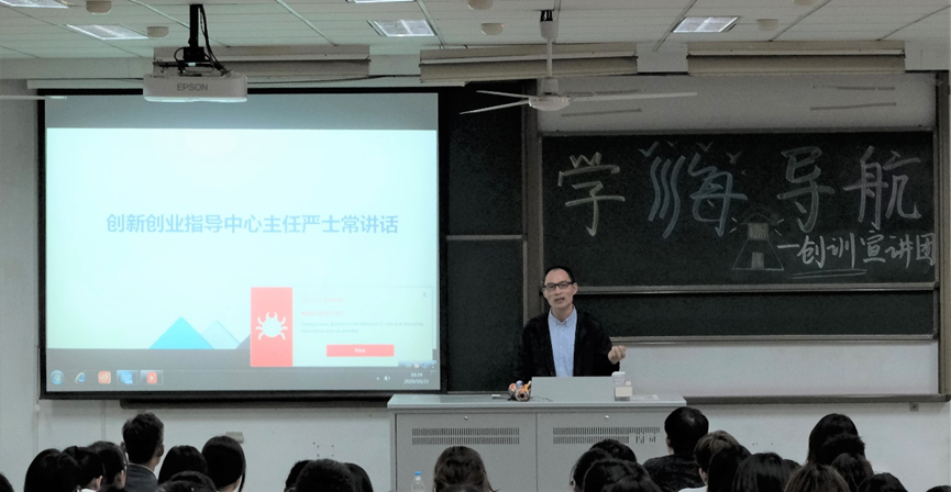 2020年10月22日,草莓视频 “学海导航”系列讲座——创训宣讲会于江宁校区致用楼117举行。本次活动邀请了草莓视频 院张蔚副院长、学院创新创业指导中心主任严士常老师、优秀团队负责人沈骁腾老师、李欢老师作为主讲嘉宾,他们就自己的教学经历、研究方向和在创训方面对学生的要求和展望等方面向同学们做了详细介绍。