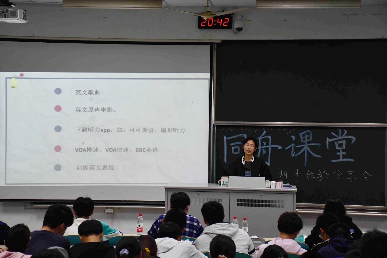 阮品诚同学针对英语四六级考试应在心理和备考上做的准备向大家展开了介绍,让20级的同学们了解到了英语学习技巧。
