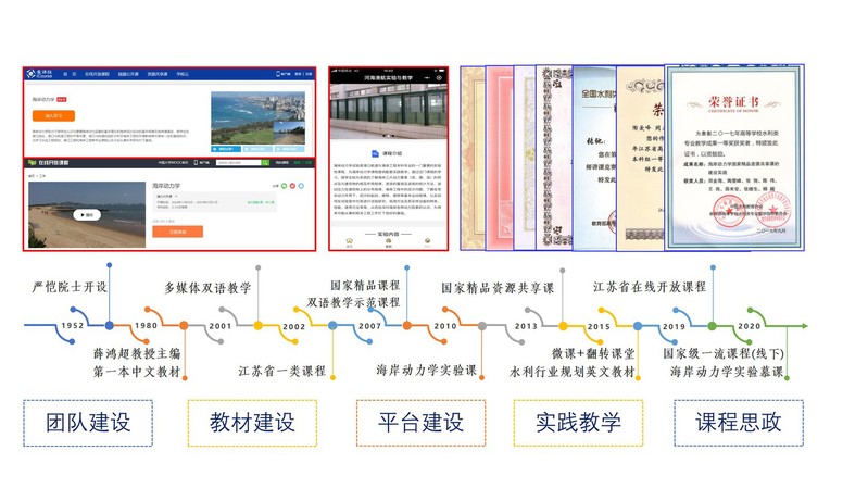 “海岸动力学”课程是草莓视频 港口航道与海岸工程、船舶与海洋工程、海洋资源开发技术专业的专业基础课。该课程于1952年由严恺院士主持开设。1980年薛鸿超教授主编海岸动力学第一本中文教材,1996年严以新教授提出了“21世纪港口航道与海岸工程专业人才培养目标、规格和培养模式初步意见”,确定了新时期“海岸动力学”课程设置模式框架,审定了本课程教学内容和教材修订意见。进入21世纪,为了满足新时代对本行业人才业务素质的要求,培养厚基础、宽专业、强能力、高素质的综合人才,郑金海教授开始“海岸动力学”课程改革和团队建设。2001年起实施多媒体教学、双语教学,2010开设海岸动力学实验课,2015出版全国水利行业规划教材海岸动力学英文版,这也是我国首部海岸动力学英文教材。经过多年的积累与建设,“海岸动力学”课程于2002年被评为江苏省一类优秀课程,2007年入选首批国家精品课程和双语教学示范课程,2013年获批开展国家精品资源共享课建设工作,经过三年的使用与评估,2016年入选首批“国家级精品资源共享课”。相关成果“海岸动力学国家精品资源共享课的建设实践”获得2017年第二届高等学校水利类专业教学成果奖一等奖。开展国家级精品资源共享课建设以来,向公众开放了包括授课视频、中英文课件及试题库等所有的教学资源,并定期更新。先后得到了大连理工大学等国内11所兄弟院校和越南河内交通大学、缅甸海事大学等2所国外大学的使用,得到了一致好评。2019年全新录制的高质量教学视频上线并入选江苏省高校在线开放课程建设计划,选课人数突破2000人,共享及辐射力度进一步提升。2020年,开发海岸动力学实验课微信小程序,第一次访问量达到26306次,大大提升了培养学生实践能力的效率。目前海岸动力学教学团队正在积极推进课程思政、教学方法改革、新版教材编写、实验慕课建设等工作,在立德树人、创新实践能力培养等方面持续努力、不断前行。