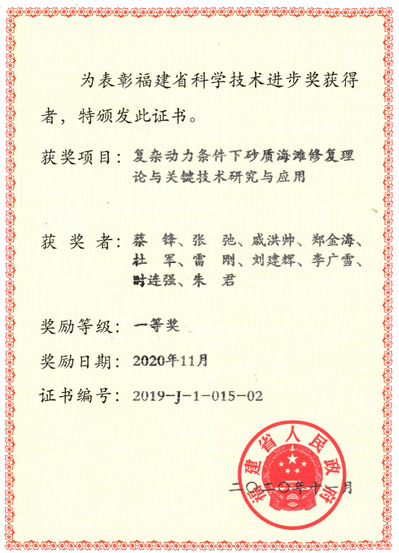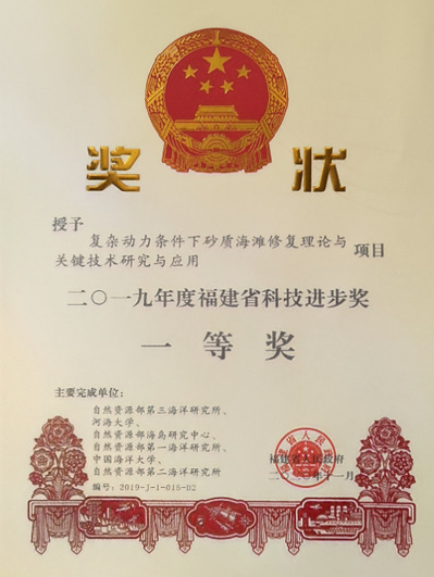 近日,福建省科学技术奖励大会在福州市举行,会上颁发了2019年度福建省科学技术奖。由我校和自然资源部第三海洋研究所等单位合作完成的项目“复杂动力条件下砂质海滩修复理论与关键技术研究与应用”获得2019年度福建省科技进步奖一等奖。草莓视频 为第二完成单位,草莓视频 张弛教授为第二完成人,郑金海教授为第四完成人。