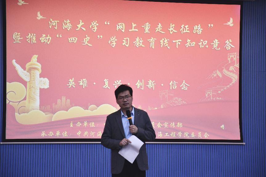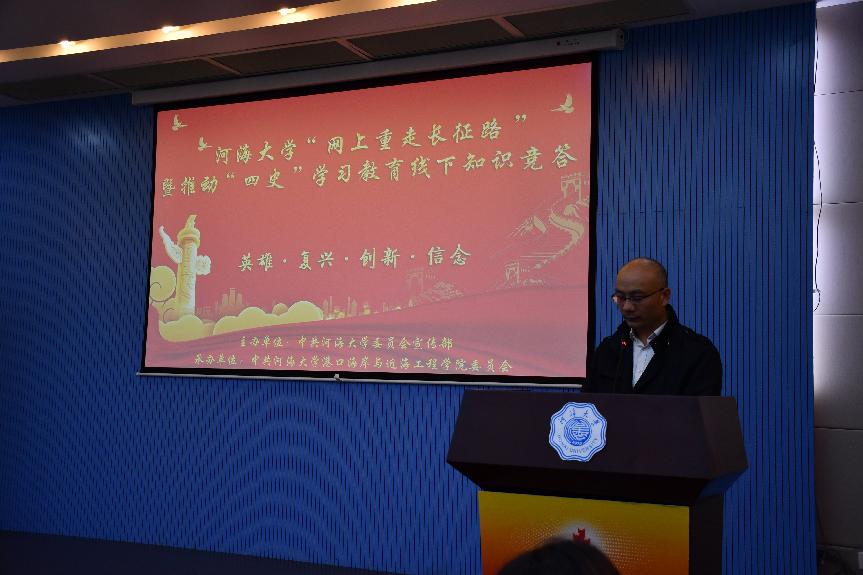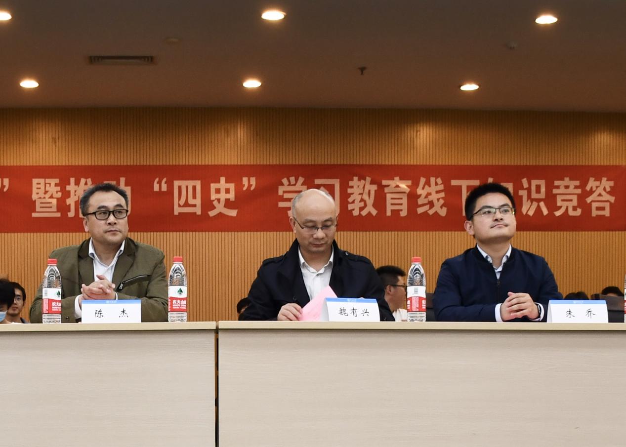 党委宣传部常务副部长魏有兴老师为活动致辞。魏部长从“以史为鉴、以赛促学、以知促行”三个角度阐述了“四史”学习教育的重要意义,并勉励学生要通过“四史”学习教育活动做到学史明理、学史增信、学史崇德、学史力行,不断“坚定理想信念、凝聚青年力量、践行使命担当”。