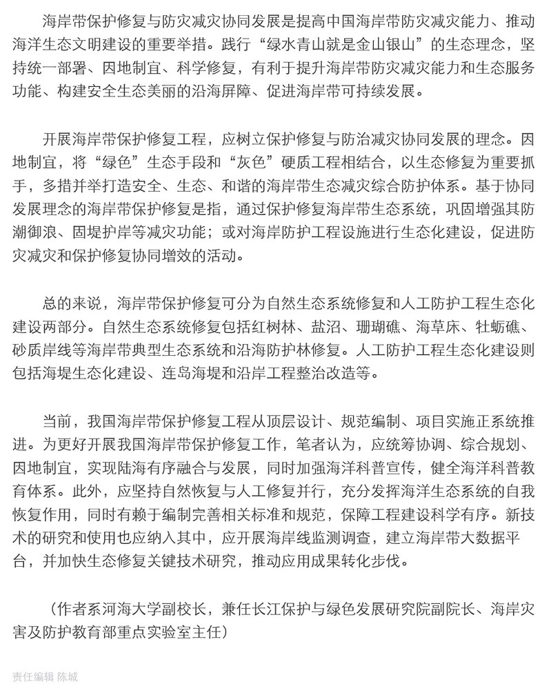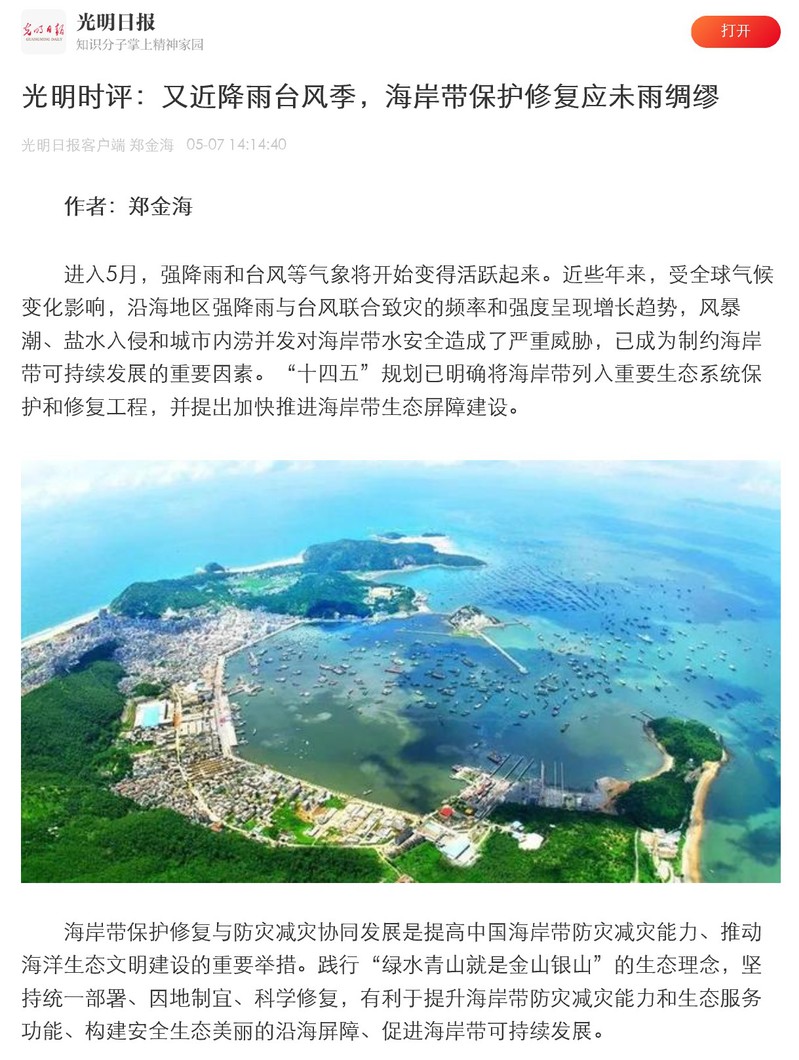 2021年05月07日,草莓视频 郑金海教授在《光明日报》的时评栏目,发表题为《光明时评:又近降雨台风季,海岸带保护修复应未雨绸缪》的署名文章。探讨了制约海岸带可持续发展的因素,并提出了我国海岸带保护修复与防灾减灾协同发展的工作建议。全文如下: