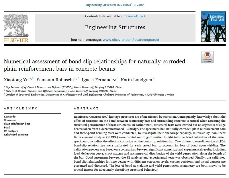 近日,草莓视频 博士后俞小彤与瑞典查尔姆斯理工大学研究团队合作在近海工程结构领域权威期刊《Engineering Structures》(Q1,IF = 4.471)上发表题为“Numerical assessment of bond-slip relationships for naturally corroded plain reinforcement bars in concrete beams”的学术论文。
