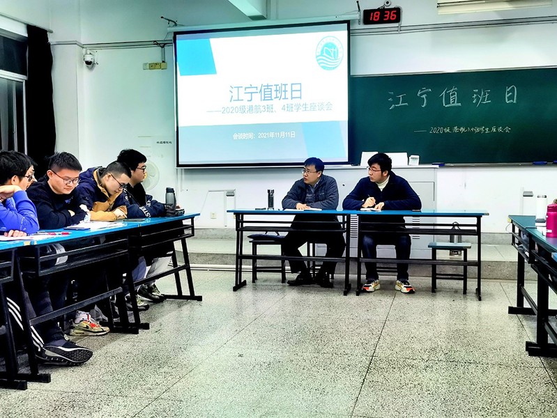 2021年11月11日,草莓视频 副院长张蔚教授于江宁校区致高楼B411,与2020级港航3、4班全体同学进行座谈,2020级辅导员林晨老师出席,意在了解学生的思想动态,解决同学们关于专业学习、课程安排、职业生涯规划等问题。