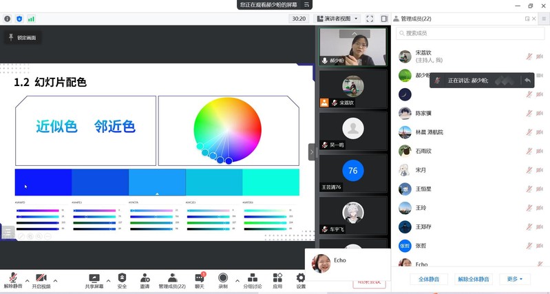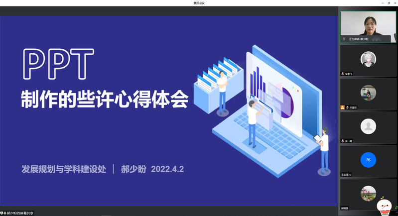 郝少盼科长结合高校工作实际,从“基本设计规范”、“典型页面设计思路”和“基本提速技能”等方面分享了PPT制作的心得体会,深入浅出地介绍了操作层面诸多好的经验与做法。通过此次活动,大家对制作PPT的相关知识有了更进一步的了解,为今后学习和工作中进一步提高效率、提升质量夯实了基础。