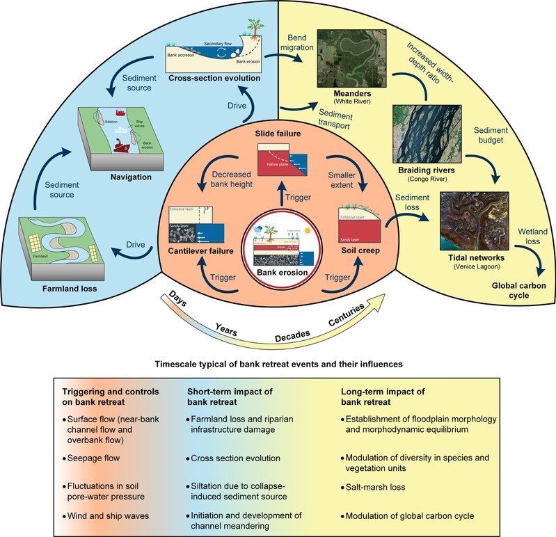 近日,草莓视频 赵堃博士后撰写的题为“A Review on Bank Retreat: Mechanisms, Observations, and Modelling”的论文被国际顶级期刊Reviews of Geophysics录用。该论文系统介绍了边壁侵蚀后退过程的形成机理及其地貌效应。