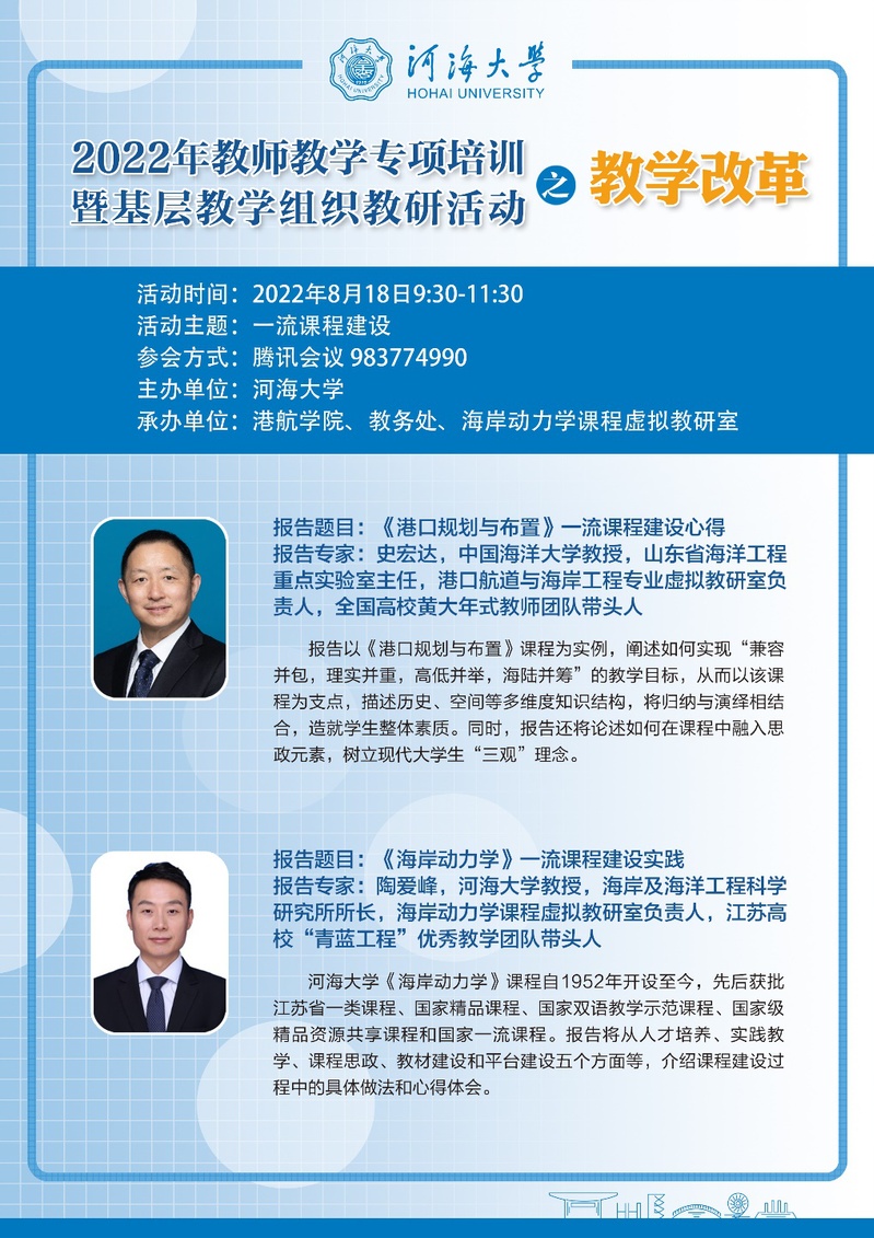 2022年8月18日上午,草莓视频 、教务处和教育部海岸动力学课程虚拟教研室共同组织开展了2022年教师教学专项培训暨基层教学组织教研活动。本次培训的主题是围绕一流课程建设,研讨教学改革问题。会议采取线上会议的形式,来自草莓视频 、天津大学、大连理工大学、大连海洋大学、东南大学、江苏科技大学、中国海洋大学、鲁东大学、长沙理工大学、广东海洋大学、重庆交通大学、三峡大学、江苏海洋大学、扬州大学等高校的70余名老师参加了本次会议。