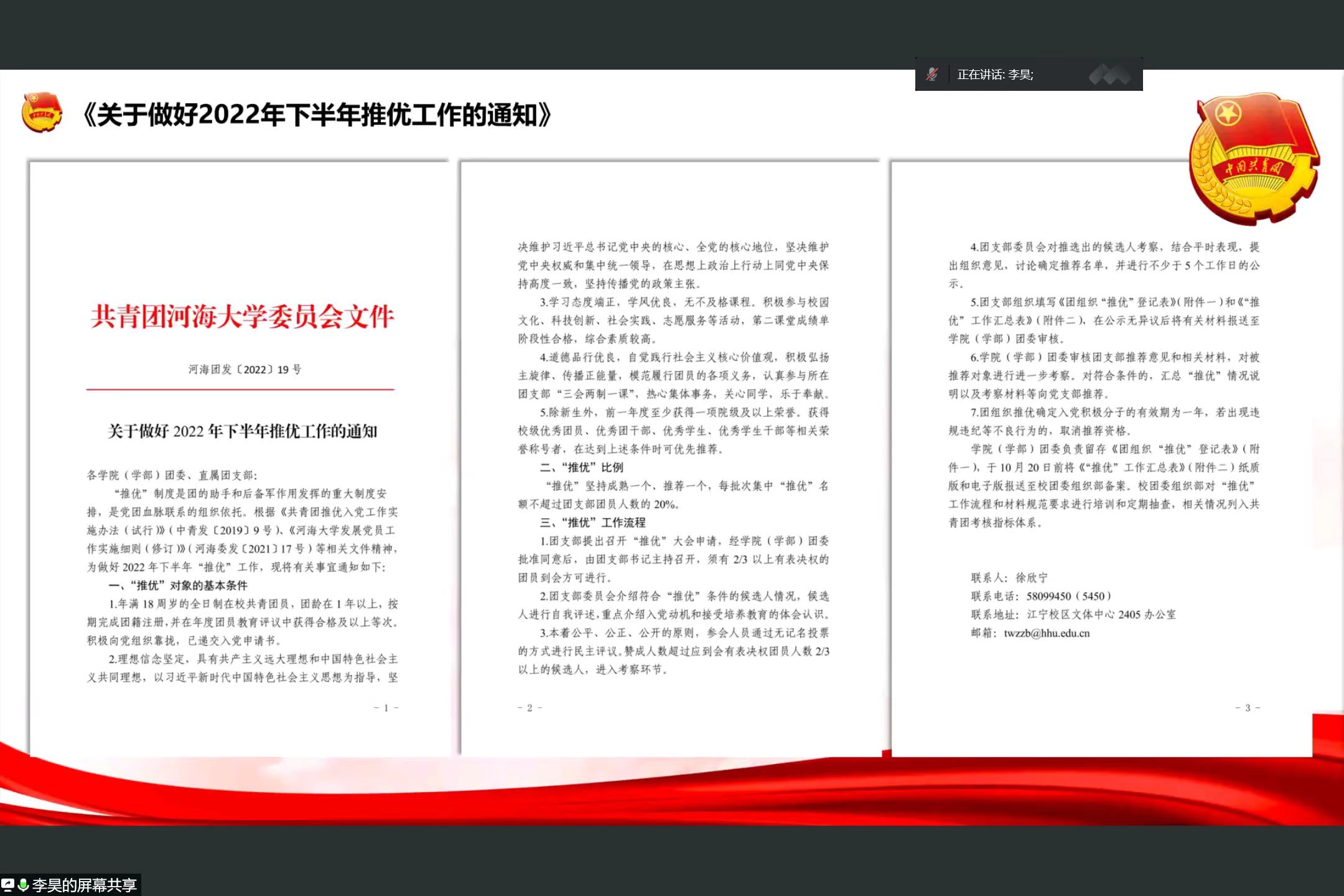 2022年10月6日,学院组织员朱钰老师和团委副书记李昊面向全体2022级本科生就党团员发展工作做详细介绍,为进一步开展学生入党积极分子培养教育、学生党员发展和教育管理服务、指导学生党支部和班团组织建设等工作奠定基础。