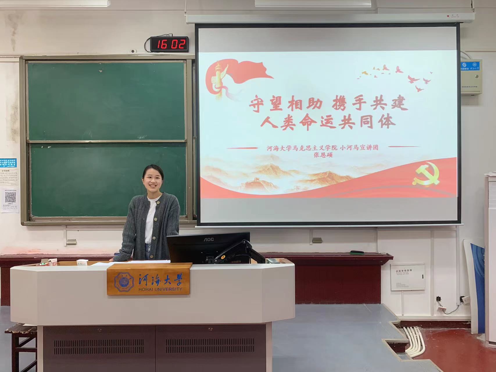 张恩硕从“九个数字”带领学生梳理了党的二十大报告,立足党的二十大报告,详细讲述了构建人类命运共同体重要理念的诞生及发展过程,十年来,构建人类命运共同体从理念转化为行动、从愿景转变为现实。针对如何正确理解和阐释人类命运共同体这一理念,她介绍了全球安全倡议、全球发展倡议、全人类共同价值的“三全引领”理论根基,并从经济、政治、文化、医疗、生态五个层面结合实际案例讲述了推动构建人类命运共同体的具体实践。最后张恩硕强调了构建人类命运共同体的时代价值,它为全球生态和谐、国际和平事业、变革全球治理体系、构建全球公平正义的新秩序贡献了中国方案和中国智慧。